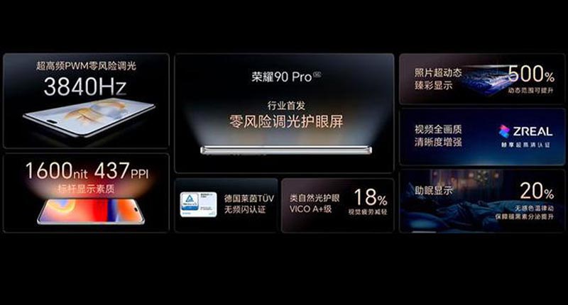 此次發布會帶來了榮耀90和榮耀90 Pro,全系首發搭載了2億像素寫真相機,以及3840Hz超高頻PWM零風險調光功能。榮耀終端有限公司 CEO 趙明先生稱,這次的榮耀 90 系列,他們希望在影像(2 億像素寫真相機)、屏幕(3840Hz 超高頻 PWM 零風險調光護眼屏)、續航(5000mAh 高密度超大容量電池)這三個領域有所突破。